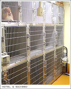入院治療やホテル滞在時の動物たちのお部屋もたくさん用意しています。猫専用ルームもあります。 |